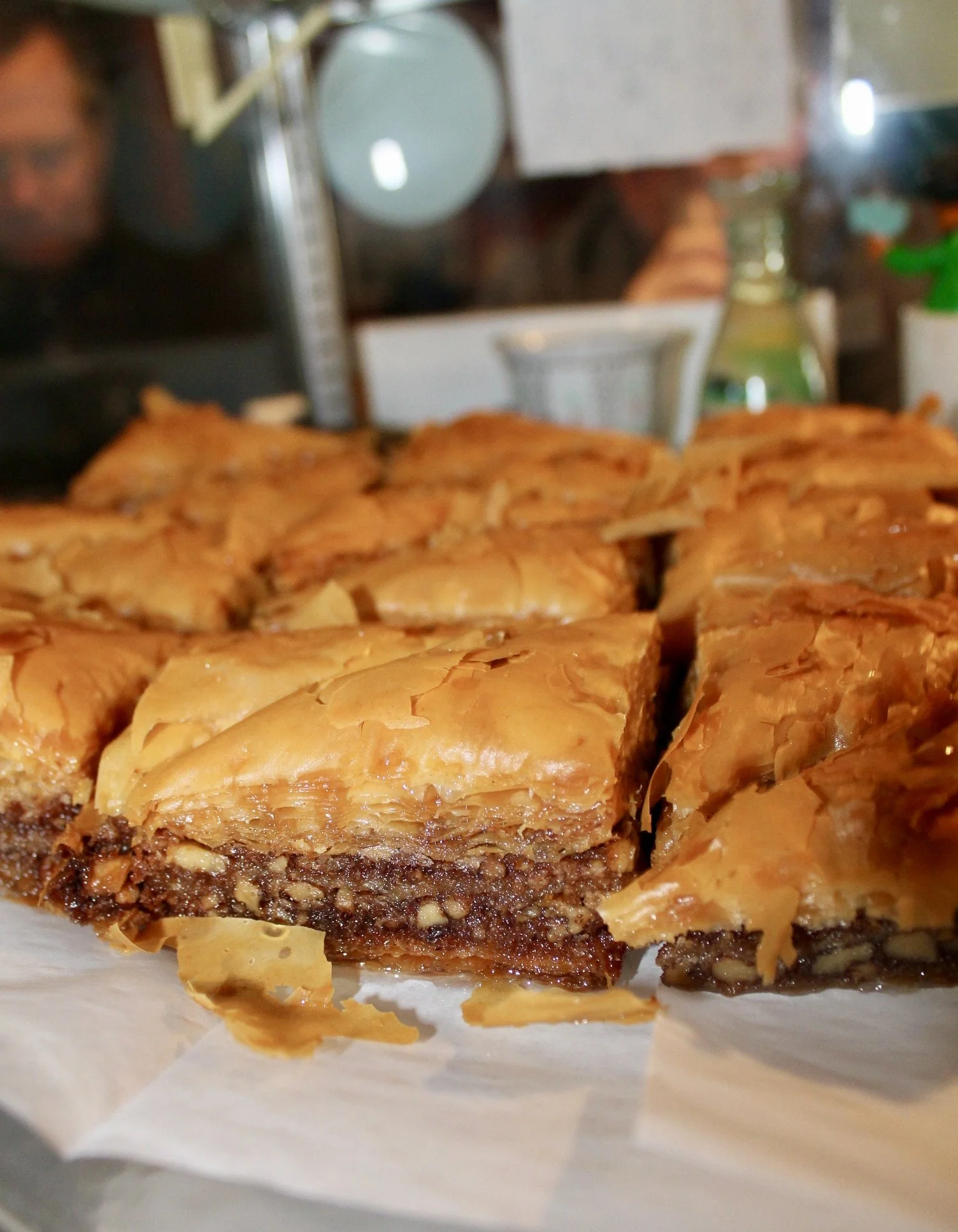 the most perfect salad there ever was. We spread a plate with hummus, then top it with fresh greens, red cabbage, red onion, tomatoes, cucumber, more hummus, and falafel crumbles. Served with tahini and spiced garlic dressing.